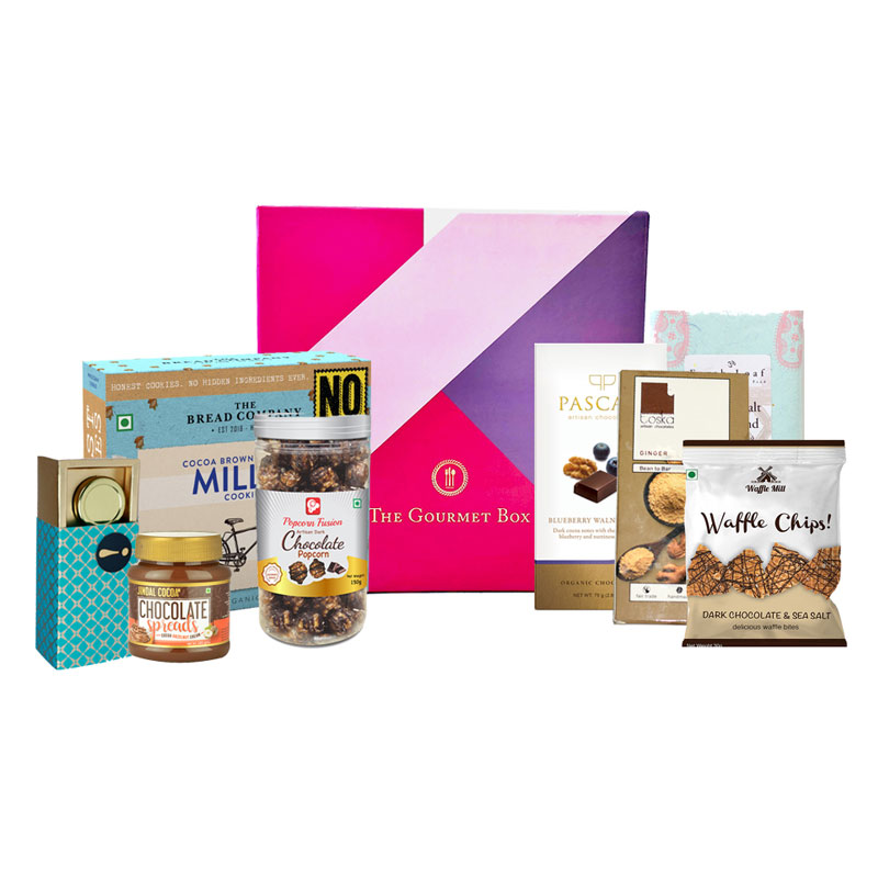 This box contains : Cocoa Brownie Millet Cookies, Dark Chocolate and Sea-salt Waffle Chips, Flavored Chocolate Spread, Dark Chocolate Flavored Popcorn, Flavored Artisan Chocolate Bars - 3, 2 Mini Fudge Jar Gift Set.The contents are delivered in a beautiful box tied with a ribbon and a personalized gift tag. This hamper can also be packaged in a gift basket on special request.