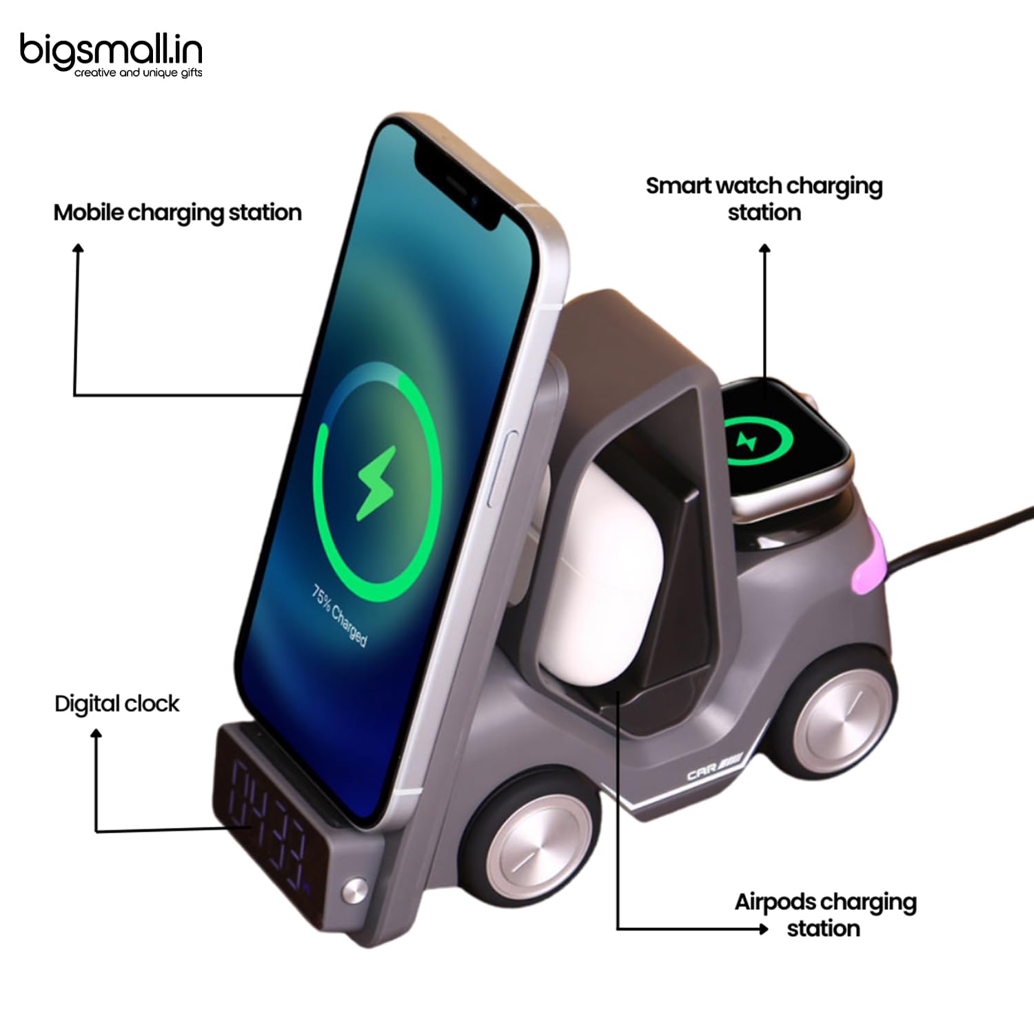 Sleek & Compact Toy Car Design – Stand out with a stylish, car-inspired charging dock that adds sophistication to your space. Space-saving and aesthetically pleasing for modern homes and offices